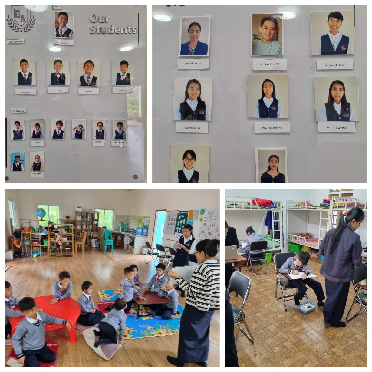 2019년부터 공동체 청년들 중에서 국제학교 선생님들로 먼저 훈련을 받으셨습니다. 그리고 지난 2021년부터 따웅지에 Preschool 을 시작하여 작년에 KG 학생들이 올 해에 1학년이 되었습니다. 금년에 새로운 KG 학생들을 받게 되어 그유나 기독학교에 어린 아이들이 총 16명으로 불어났습니다. 현재 6명의 선생님들과 2명의 보조교사로 아카데미를 섬기고 있습니다. 여기에 이지현 선생은 교사 훈련 디렉터로, 저는 학교 교목으로, 그리고 은서는Zoom 강의 선생님으로 함께 섬기고 있습니다. 현재 그유나 아카데미에 사용하고 있는 커리큘럼은 기독교 세계관(School of Tomorrow)으로KG 과정과 1학년 과정이 진행되고 있습니다. 그유나의 특이점은 전 학생 모두가 선생님들과 함께 합숙 생활하면서 정규 학과 과정을 교육받고 있습니다. 아이들도 동일하게 하루 세번 예배를 통해 말씀으로 양육받고, 300구절 성경 암송 목표로 소그룹으로 나누어 매일의 공동체적 삶을 함께 나누고 있습니다.