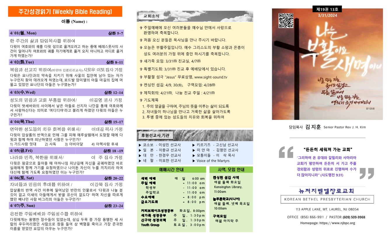 | 주간성경읽기, 교회 소식 4월 7일 (0) | 2024.04.07 |
