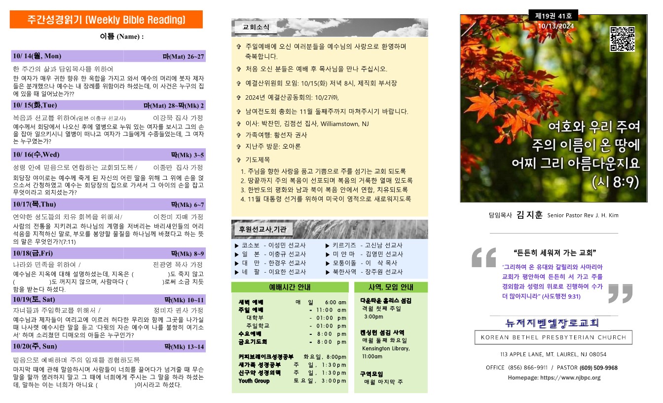 | 주간성경읽기, 교회소식 9월 29일 (0) | 2024.10.13 |