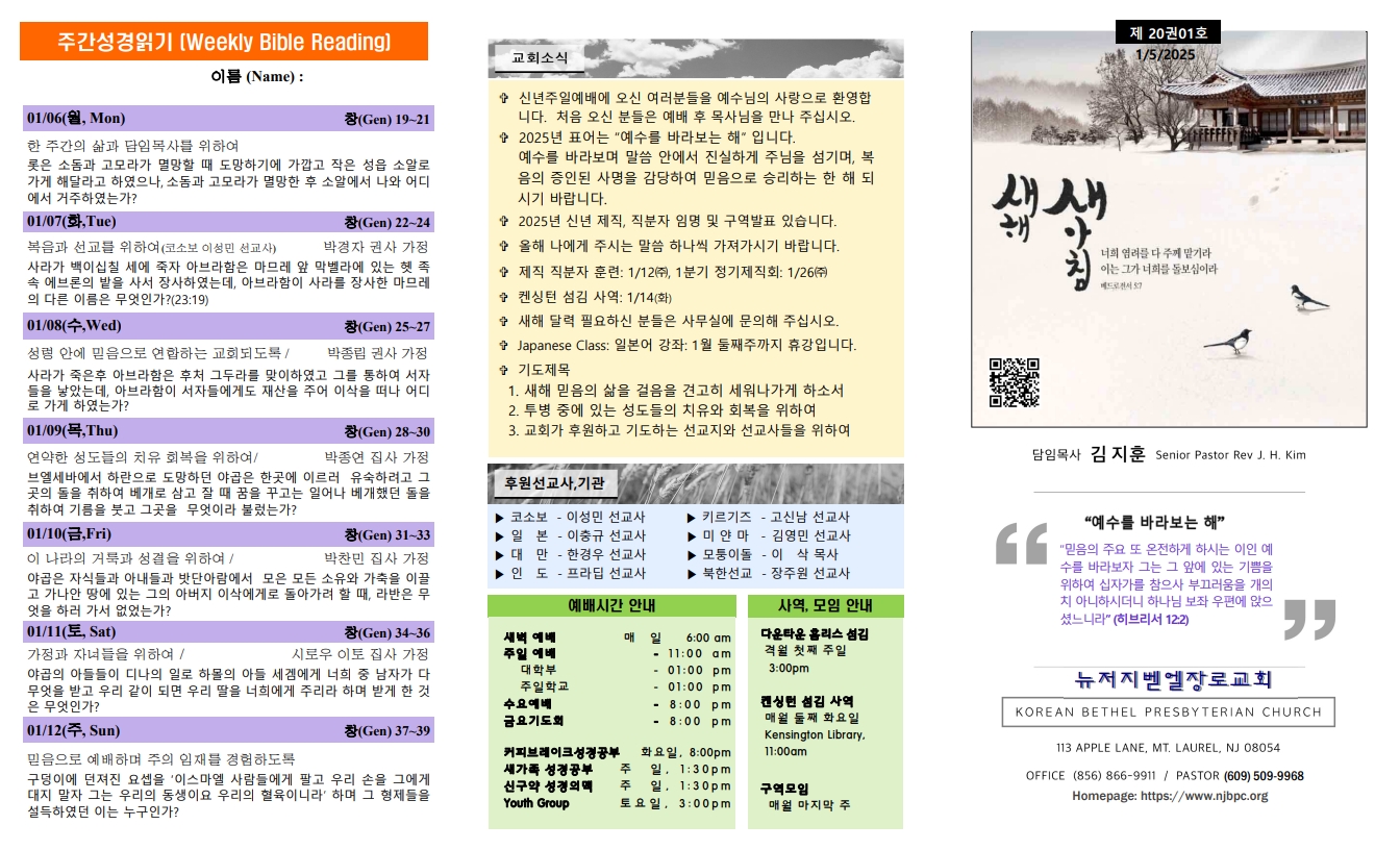 | 주간성경읽기, 교회소식 1월 12일 (0) | 2025.01.11 |