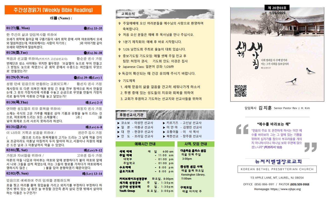 | 주간성경읽기, 교회소식 1월 12일 (0) | 2025.01.11 |