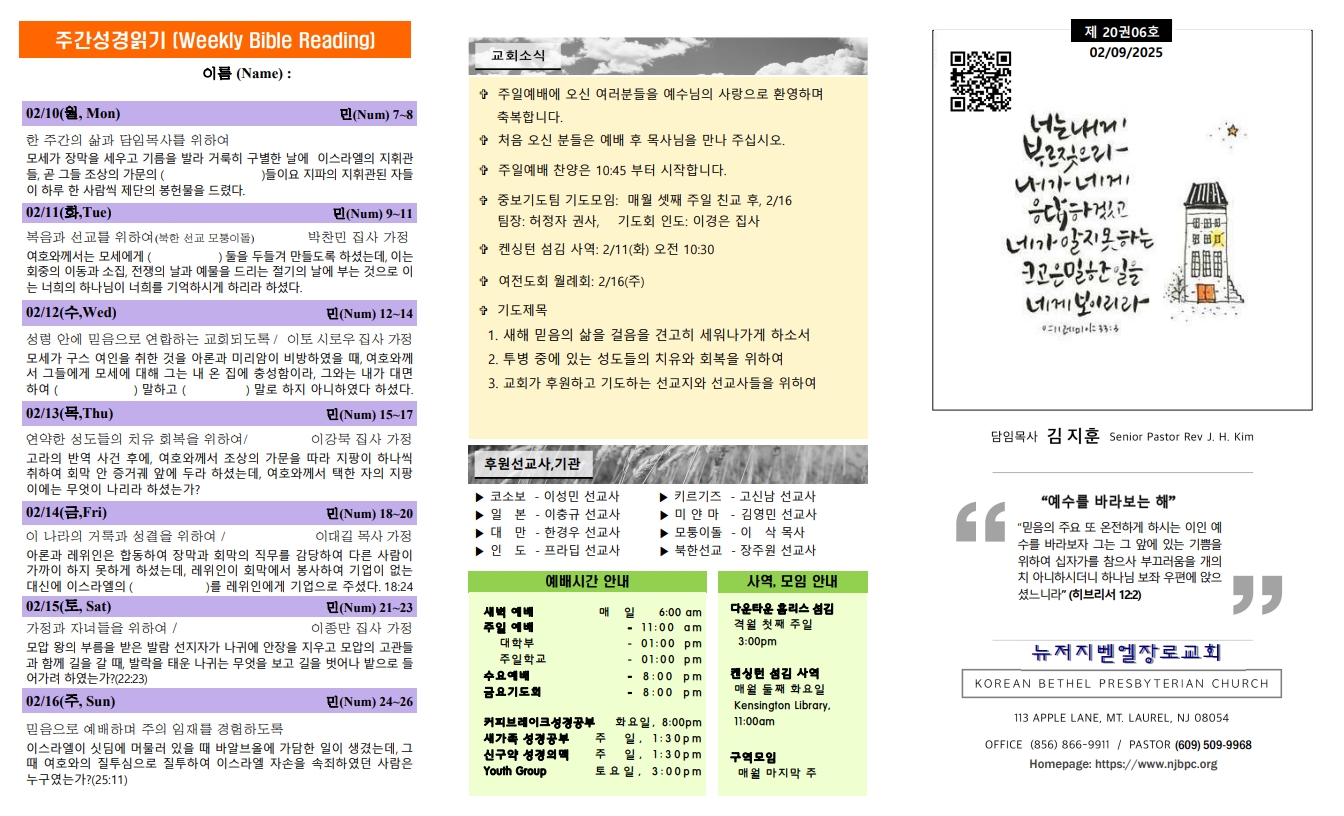 | 주간성경읽기, 교회소식 2월 2일 (0) | 2025.02.02 |
