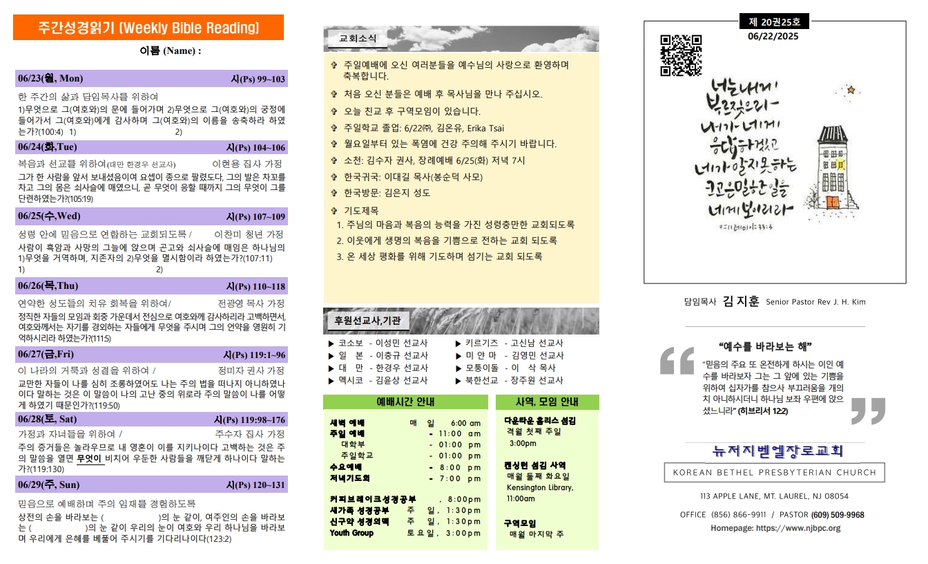 | 주간성경읽기, 교회소식 6월 29일 (0) | 2025.06.29 |