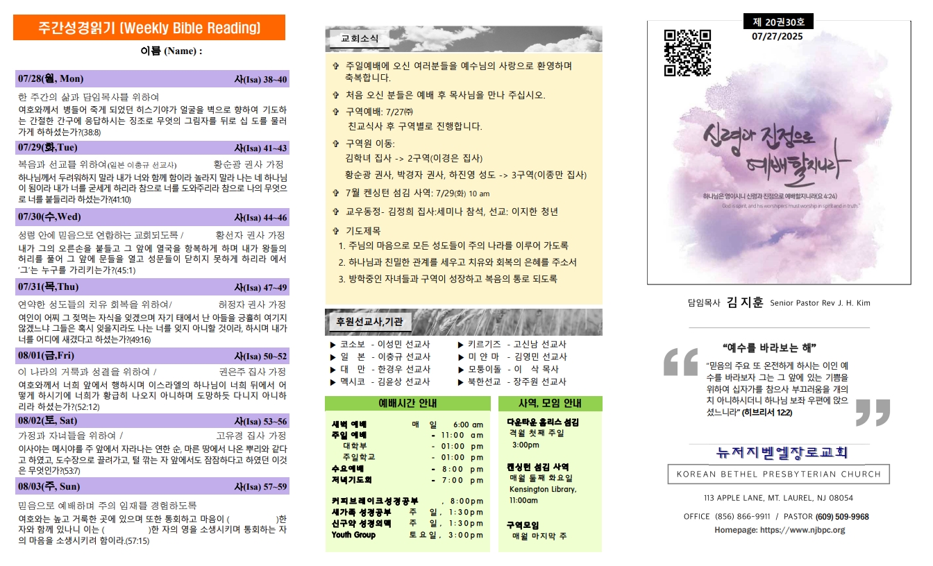 주간성경읽기, 교회소식 7월 27일