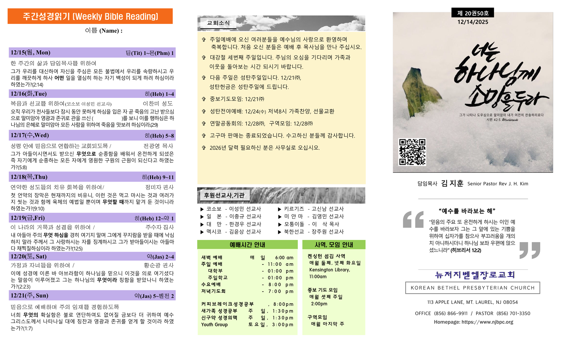 주간성경읽기, 교회소식 12월 14일
