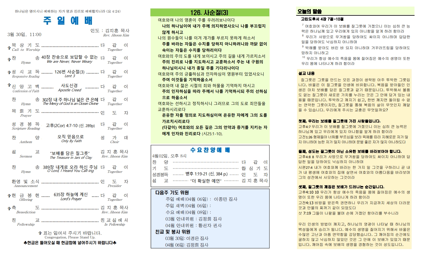 주간성경읽기, 교회소식 3월 30일